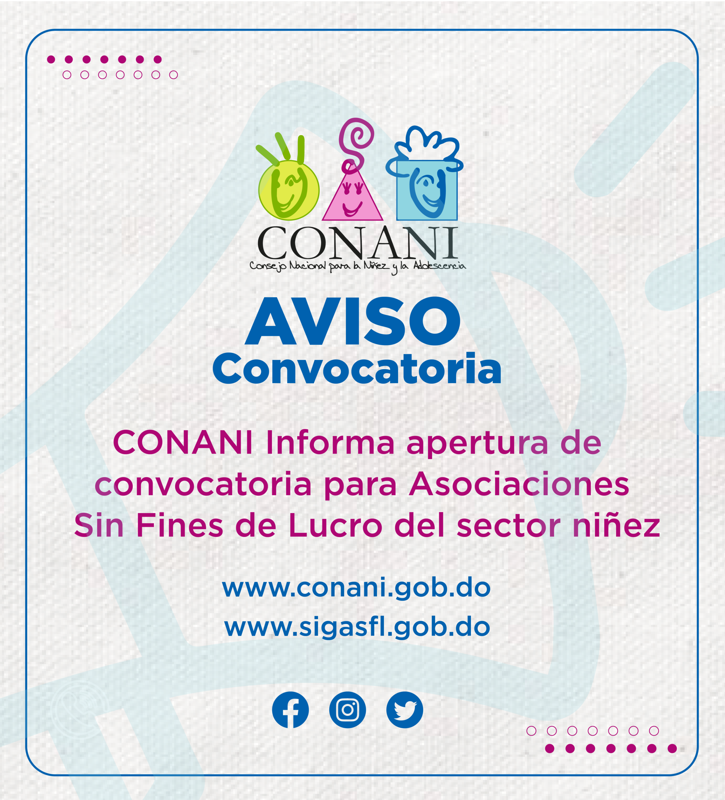 El Consejo Nacional para la Niñez y la Adolescencia (CONANI) llama a las asociaciones sin fines de lucro (ASFL) que trabajan en la protección, garantía y restitución de derechos de la niñez y la adolescencia en la República Dominicana a participar en la nueva convocatoria de solicitudes de asignaciones presupuestarias o subvenciones del Estado para el año 2027.